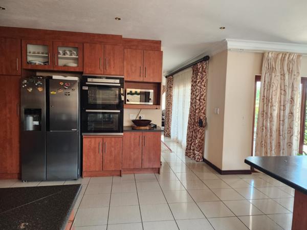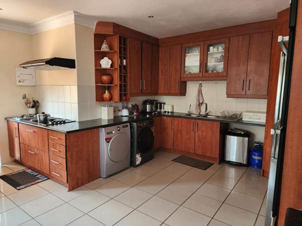 The functional kitchen features ample wooden cabinetry, dark countertops, a gas hob with extractor fan, double sink, and space for a washing machine and dryer. Accommodation includes three comfortable bedrooms, one en-suite, an additional full bathroom, and a guest toilet, plus staff quarters. Outdoors youll find a built-in braai, a well-kept garden, a double garage, and extra parking. With 24-hour security, electric fencing, access control, and pet-friendly living, this home offers a peaceful, secure lifestyle in one of Hartbeespoorts most scenic estates.