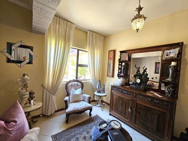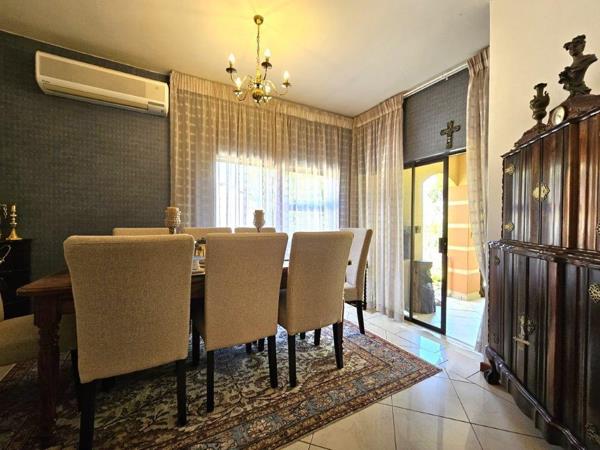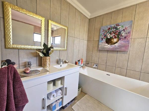 As you step through the beautiful entrance, you are greeted by a light-filled living area, with two lounges one with sliding doors to the patio and a dining room that opens up to the covered patio with a built-in braai. The kitchen is equipped with space for one appliance, making it ideal for those who love to cook.
