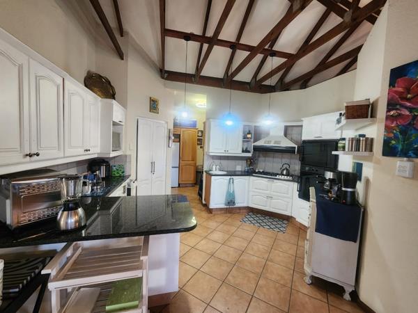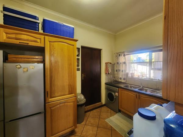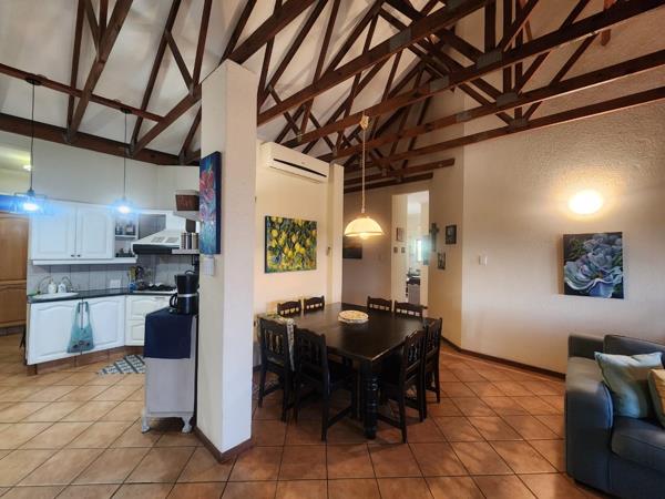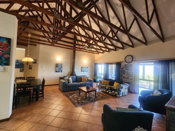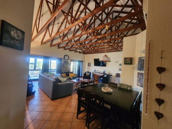 The open-plan living area, complete with a fireplace, flows onto a spacious balcony featuring a built-in braaiperfect for entertaining or simply enjoying the natural surroundings. The kitchen is well laid out with loads of cupboard space, plus a separate scullery and laundry for added practicality.