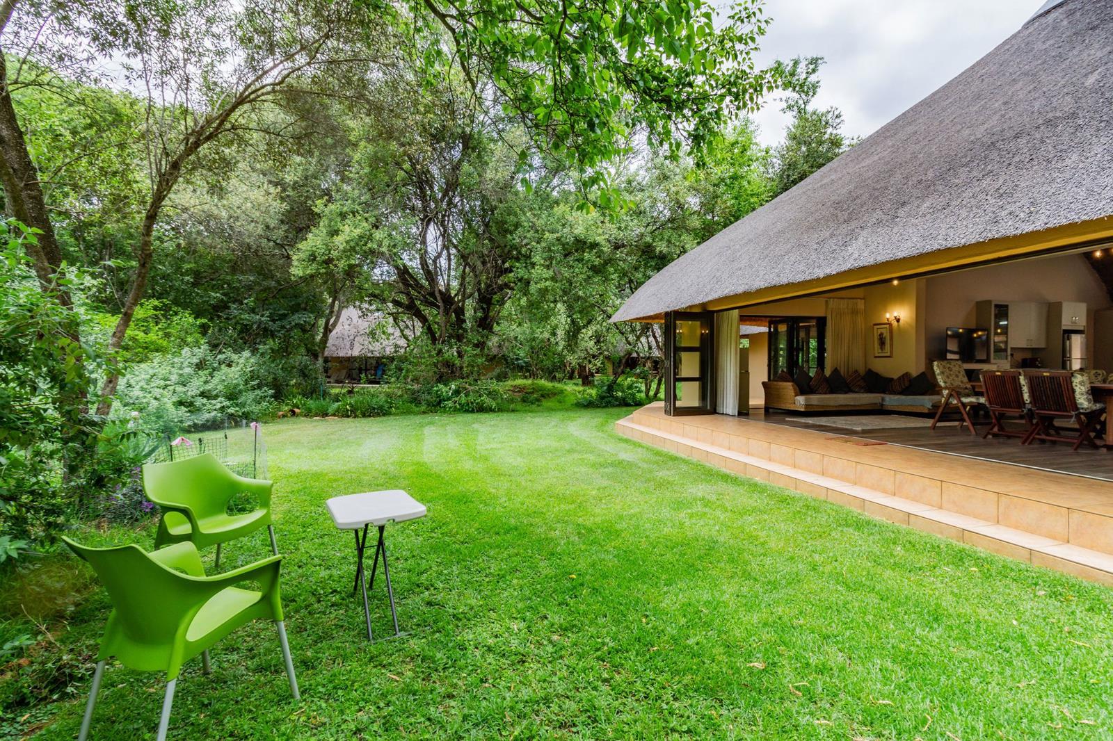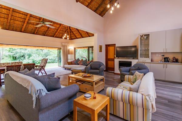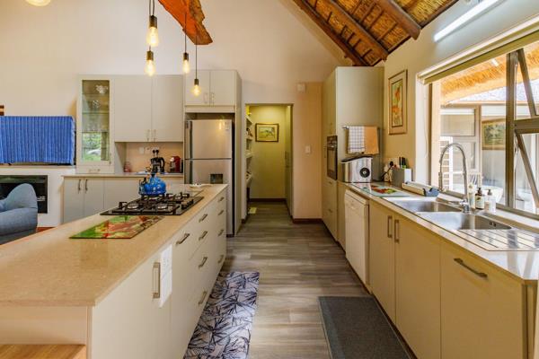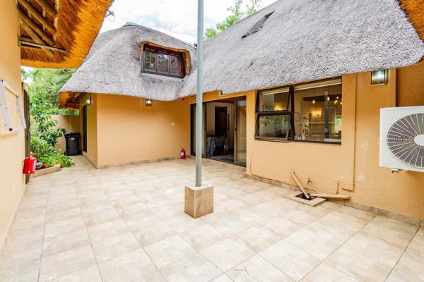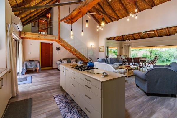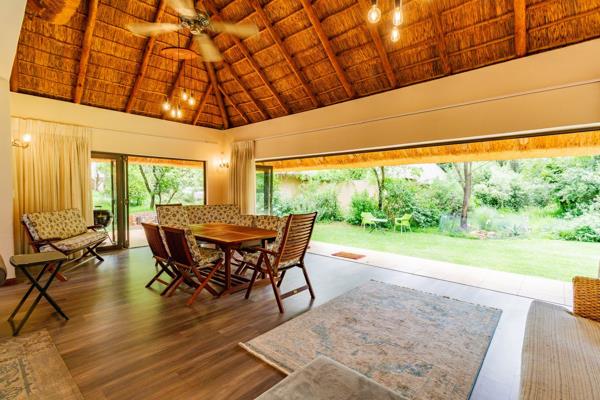 Thatched wonder world. Exclusive mandate. Embrace a thatched wonder world as this exquisite property unveils a hidden gem within a lush green garden and its serene surroundings. Open the stack doors to entertain guests in the living area that seamlessly integrates the indoors with the outdoors or enjoy cosy gatherings around the boma.