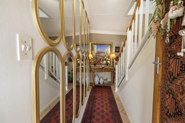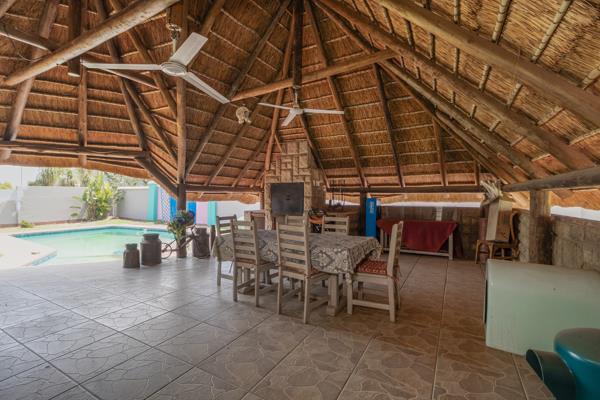 The semi open-plan living and dining areas flow seamlessly to a large thatched entertainment patio with a built-in braai, overlooking the sparkling pool and garden the perfect setting for entertaining family and friends.