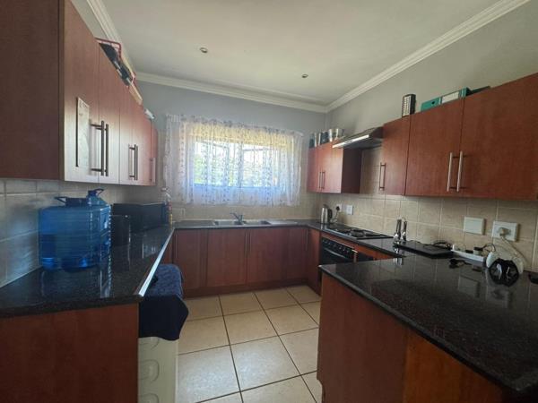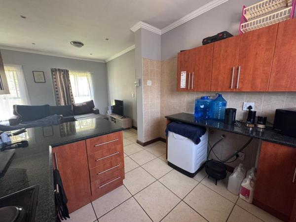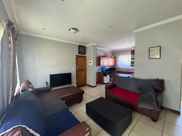 The apartment offers open-plan living with a modern kitchen featuring space for two appliances. Two well-sized bedrooms with built-in cupboards share a full bathroom. The unit is north-facing, allowing for plenty of natural light and warmth throughout the day. A covered patio extends from the living area, providing a private and versatile space ideal for morning coffees or relaxed evenings.