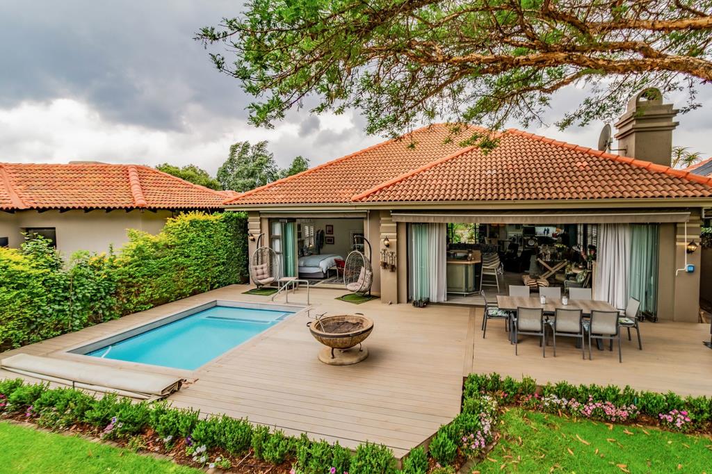 The bar area, complete with a gas fireplace, adds a touch of charm, perfect for winter evenings or lively summer soirees. Stack doors open out to the patio, allowing indoor and outdoor spaces to merge effortlessly. A sparkling pool alongside the patio offers breathtaking 180-degree views of the lush green fairways and the Magaliesberg Mountains in the distance. It''s an ideal space for family and friends to gather, relax, and create memories.