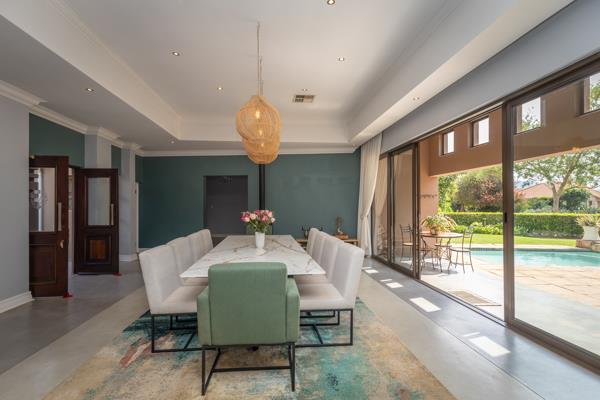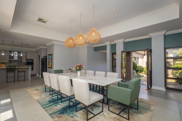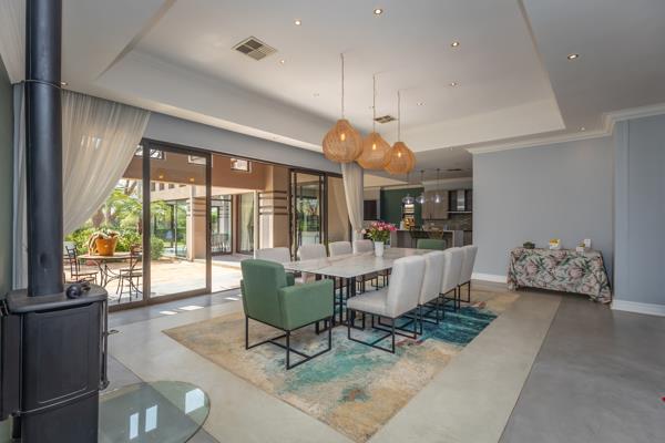 The expansive open plan living and dining area is designed with both comfort and connection in mind. Large sliding glass doors flood the space with natural light and open seamlessly to the garden and pool on one side and the enclosed patio with a built-in bar & braai on the other side creating the perfect indoor-outdoor flow for family living & entertainment.