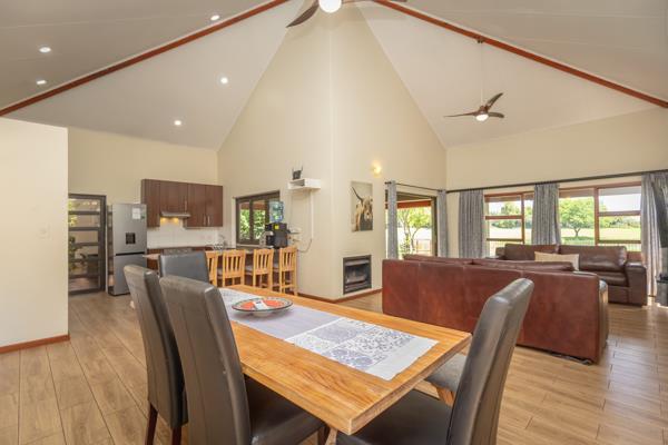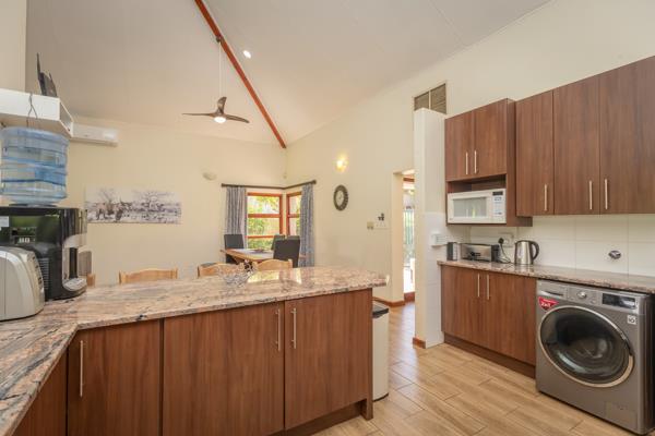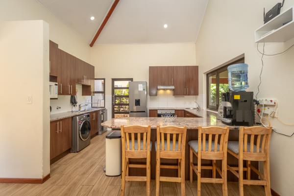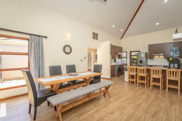 This home features an expansive open plan layout that flows seamlessly from the open plan kitchen and dining area into two inviting living spaces with high ceilings and filled with natural light. The expansive covered patio with its handy serving hatch, a built-in braai and outdoor basin flows onto a private, fenced garden and sparkling pool which is ideal for family fun and year round entertaining