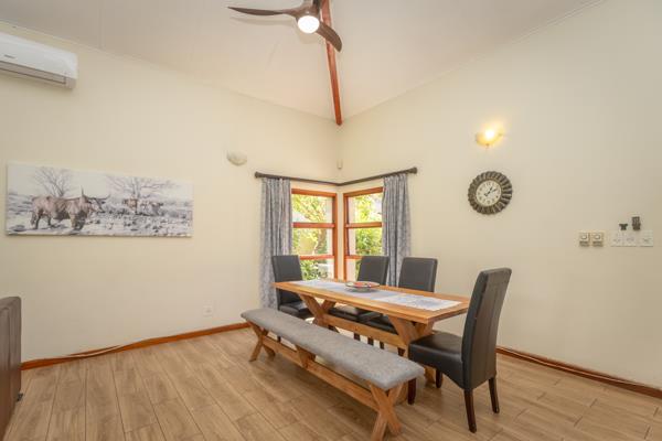 The main bedroom offers a spacious retreat with its own en-suite bathroom and generous cupboard space. A second en suite bedroom, is positioned further along the passage for added convenience. The third bedroom is served by a full bathroom, ideal for family or visiting guests. All bedrooms are air conditioned.