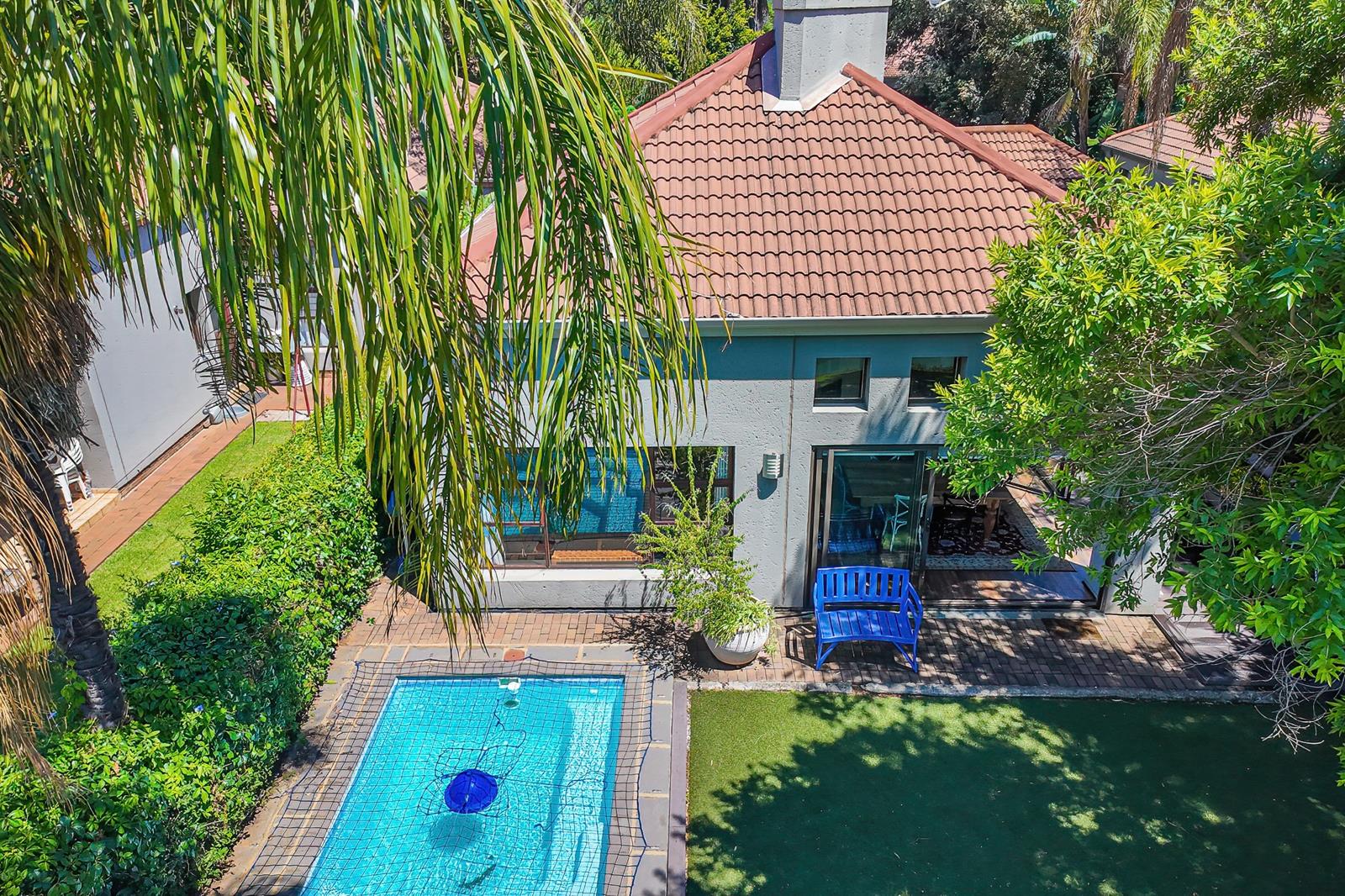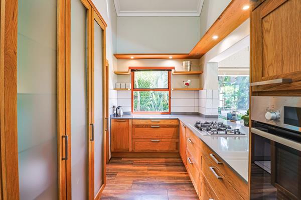 The spacious, open plan living area features a dramatic vaulted ceiling and warm wooden flooring, creating an inviting and character filled space. Flowing from the living room is the tastefully designed kitchen and dining area, which boasts a modern gas cooktop and separate scullery. Seamlessly merging the indoor and outdoor. The expansive glass sliding doors open out to a lush, private outdoor setting with an enclosed garden and private pool. Perfect for family time or entertaining.