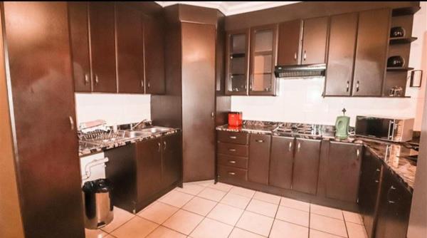 The gorgeous well sized kitchen, overlooking the open plan living area, leading to the patio, with a built in braai, and a beautifully maintenance garden.