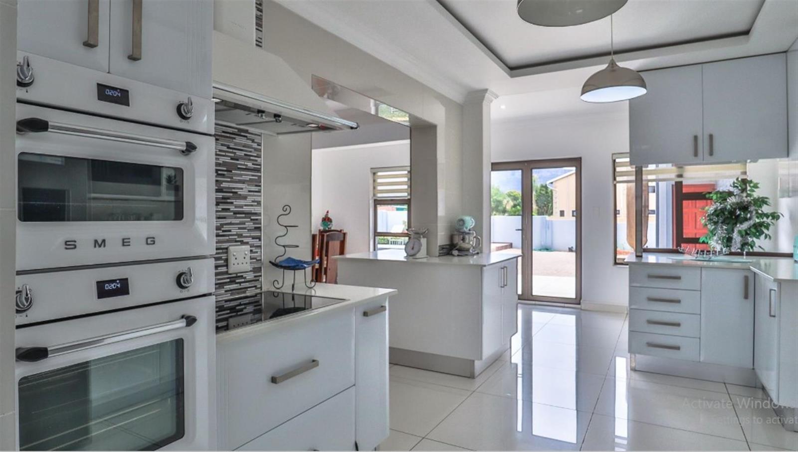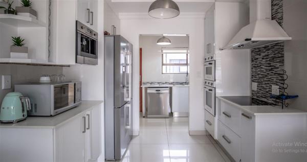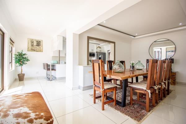 As you step inside this magnificent house, you will be greeted by a spacious and elegant living area, perfect for entertaining guests or simply relaxing with your loved ones. The high ceilings and large windows allow for an abundance of natural light, creating a warm and inviting atmosphere from its North facing advantage. The space design seamlessly connects the living areas to the modern kitchen, complete with top-of-the-line Smeg appliances and ample storage space. There are two lounges, the private lounge has a fireplace and folding glass doors opening onto the pool area. There is a laundry room with ample cupboards and space for appliances. The domestic room is spacious and there is a separate bathroom w shower and toilet for staff.