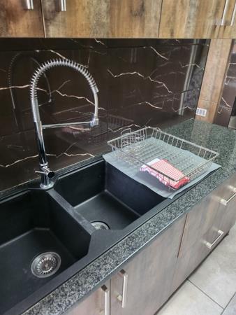 The black stone double basin is exquisite and there is under counter space for your dishwasher and also space for your microwave.