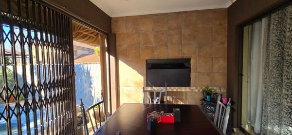 The ground floor features an open-plan kitchen with a separate scullery, seamlessly flowing into the spacious living and dining area. A dedicated braai room with sliding doors opens out to a private pool, perfect for entertaining or relaxing.