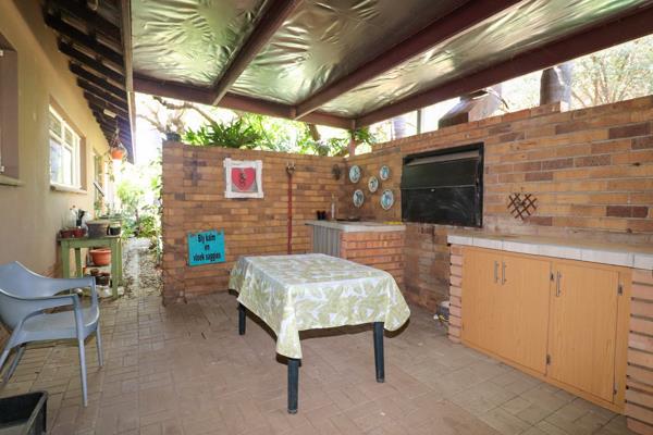A cozy veranda with a built-in braai, conveniently located near the kitchen, sets the scene for effortless entertaining. Although the kitchen cupboards are currently loose, they are included in the sale.