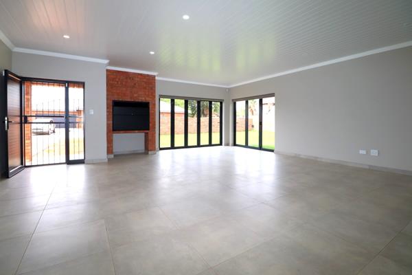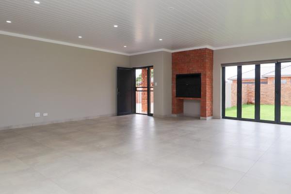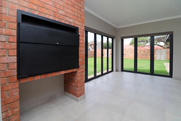 Step into the open-plan living space featuring sleek tiled floors, a built-in braai for year-round entertaining, and stacker doors that open to your own private garden complete with automated sprinklers.