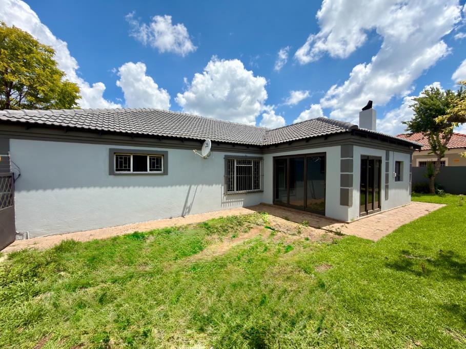 The property includes a double garage with an electric door and built-in cupboards, as well as a prepaid electricity meter. Outside, the home features a sprinkler system, two alarm systems, security beams, burglar bars, safety gates, and an electric fence for complete peace of mind.