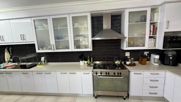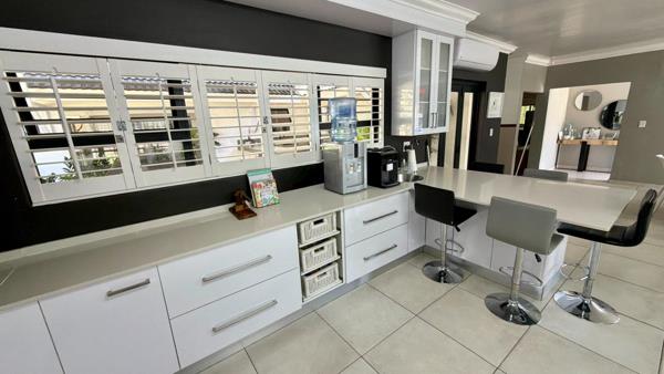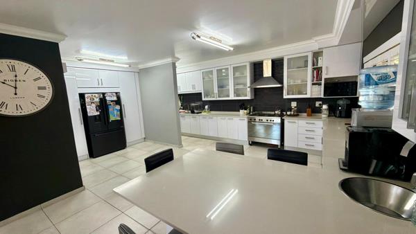 The designer open-plan kitchen forms the heart of the home for the ladies, whereas for the men the entertainment zone which consists of built-in bar and built-in braai with stack doors that lead to the sparkling pool and patio area with boma, creates a beautiful setting for hosting family and friends all year round.