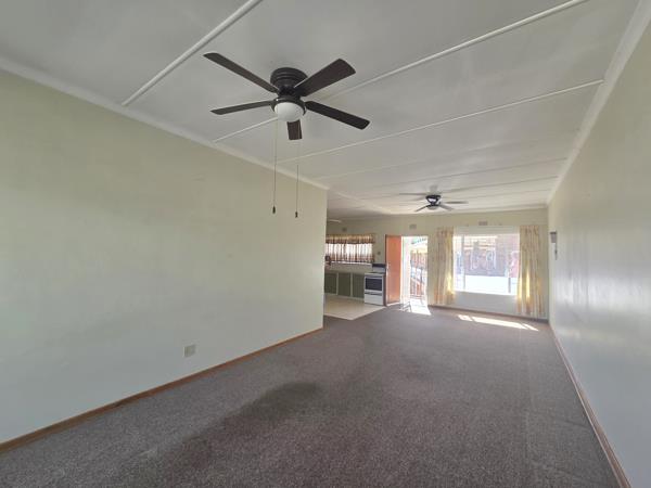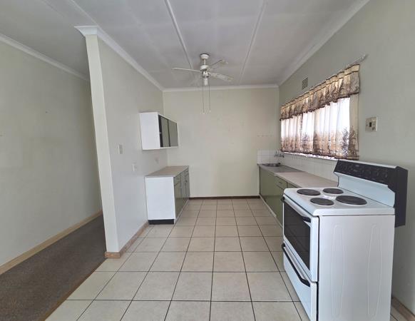 The functional open-plan kitchen offers ample cupboard space, an electric stove, and a practical scullery area for everyday ease.