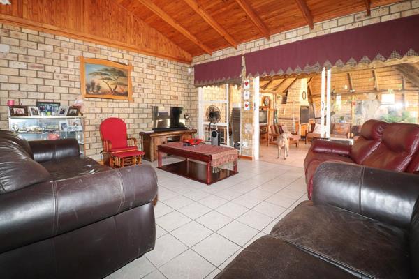 The family room has a sliding door opening onto a cozy entertainment area, fitted with a built-in-braai, overlooking the garden & sparkling pool.
