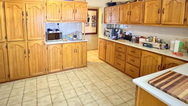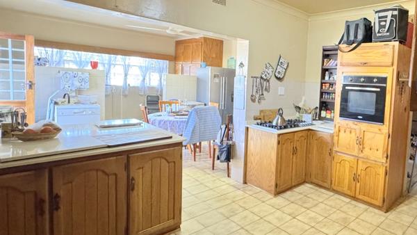 - Large kitchen with ample wooden cabinetry, gas hob and gas oven, and space for a dining table