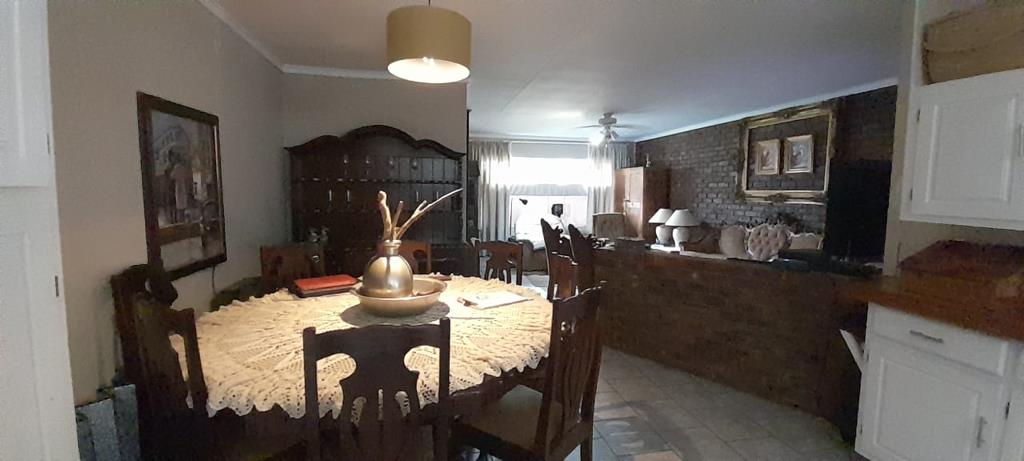 This well-maintained property features three spacious bedrooms with laminated flooring and two full bathrooms, offering comfortable accommodation for the whole family. The open-plan living area flows seamlessly into the kitchen, creating a warm and inviting space ideal for everyday living. The kitchen is well-designed with ample cupboard space and connects effortlessly to the dining area.