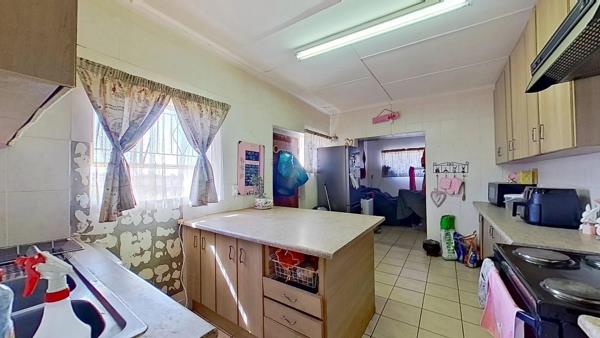 A kitchen with ample cupboard space as well as a scullery and laundry area.