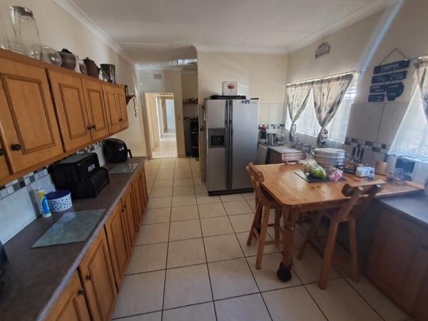 Functional Kitchen: Tiled kitchen with built-in cupboards and a separate laundry room