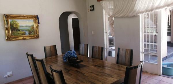This spacious family home offers four bedrooms and two comfortable lounges, providing ample room for both everyday living and entertaining. The well-designed kitchen features a separate scullery and pantry, ensuring plenty of storage and practicality. The property includes three garages, offering secure parking and additional space. Outdoors, the home boasts a swimming pool and a Lapa, ideal for relaxation and hosting guests, as well as an outside room suitable for staff accommodation or extra living space. A borehole has been installed on the property, although it has never been used, adding further potential value. Overall, this home combines generous indoor living areas with excellent outdoor features, making it ideal for family living. Call for a viewing,