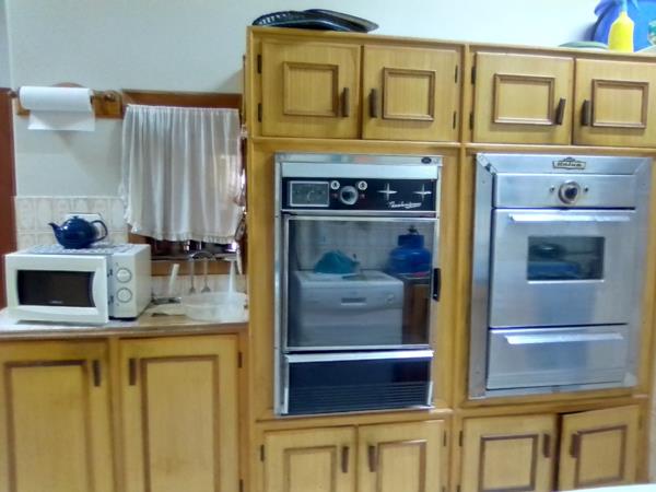 Kitchen is fitted with built in cupboards and tiled flooring.