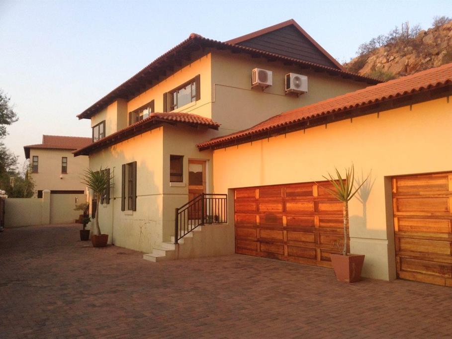 Very neat property in popular complex in Wilkoppies. 3 bedrooms, 3 bathrooms, 4 garages, and a lot of extras. Generator linked. Will paint outside. Air cons, Burglar proof windows 5mm, 2 Patio''s, water point in study and family room and extra gas stov