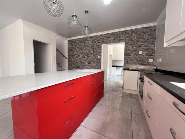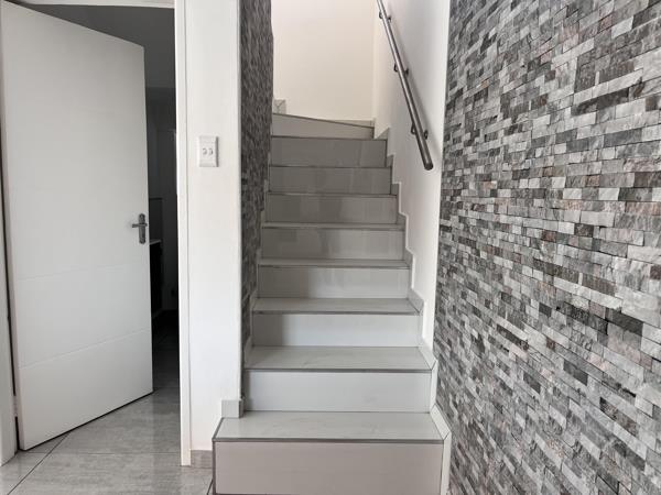 The kitchen features modern finishes, beautiful center island, glass hob and electrical oven, a scullery with space for all your appliances and a door leading to the garden. A large double garage can be accessed through the scullery. Down the hall, you will find your guest powder room... leading you upstairs , the 2 well spaces bedrooms, sharing a full bathroom, and at the end of the hallway the main bedroom with anspacious full bathroom with all the modern finishes!