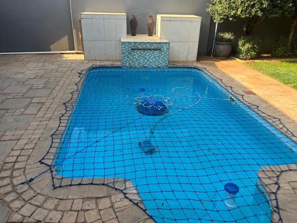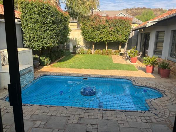 The well-appointed kitchen features sleek granite countertops, a gas stove, a pantry, and a separate scullery, making meal prep a breeze. The lounge area extends to an enclosed patio with a built-in braai, ideal for year-round gatherings. Enjoy the outdoors with ease as you step out to the sparkling pool area, your private retreat for leisure and relaxation.