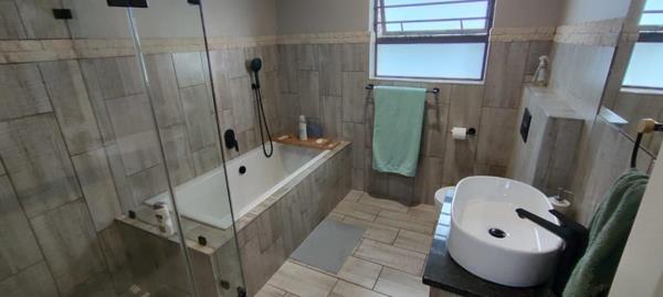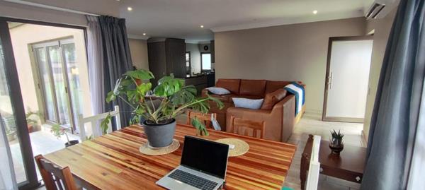 The home boasts a spacious open plan living area that includes a lounge, dining room with built-in braai, and a beautiful kitchen.