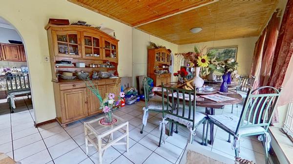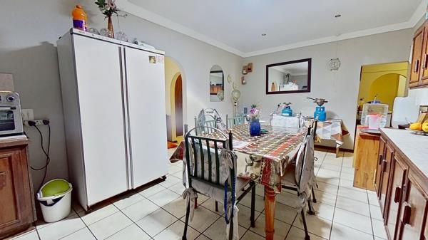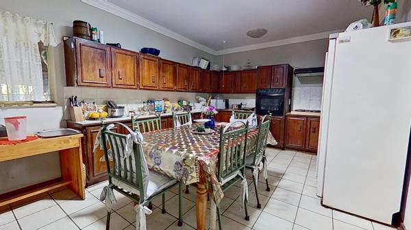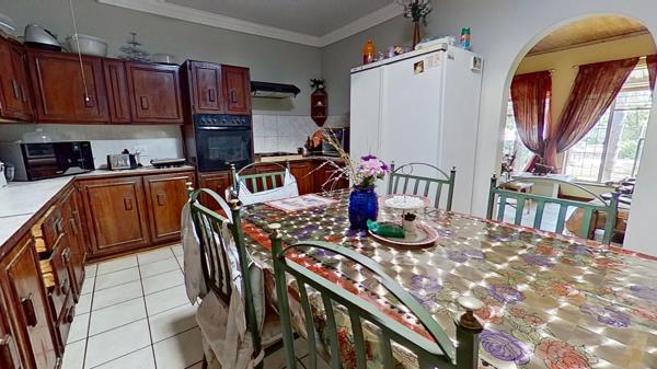 The lovely dining room leads directly into the spacious kitchen, which in itself has a lot of cupboard space.