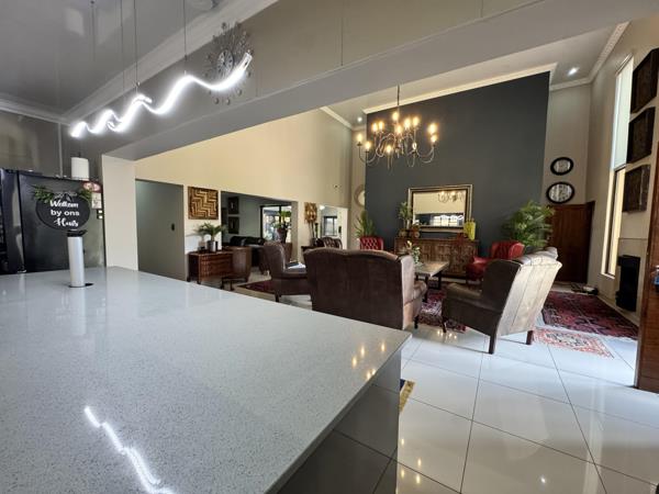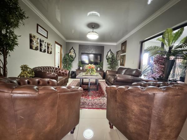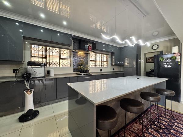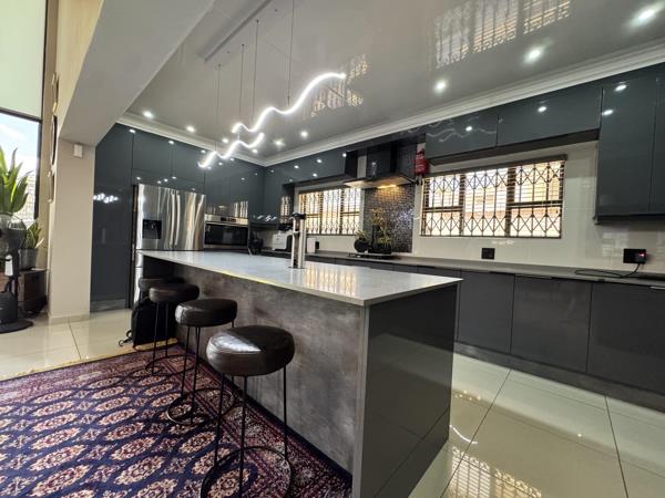 At the heart of the home, a double-volume living area creates a striking sense of space and light, seamlessly flowing into a super-modern, open-plan kitchen finished with granite countertops, a gas stove, and a brand-new oven. The adjoining scullery offers ample cupboard space and functionality for effortless living.
