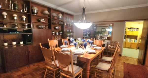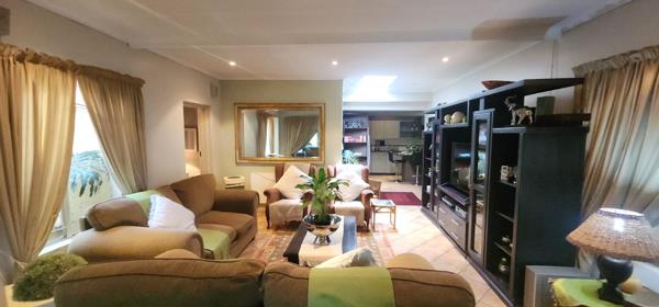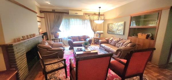 Two beautiful, expansive lounges flow into a stunning entrance hall, offering ample space for family gatherings and relaxation. The large dining room features a built-in wall-to-wall sideboard, adding to the homes charm. Step through the lounge onto an outdoor patio with a clever lever roof that opens up to let the sunshine pour in, leading to a meticulously maintained garden with an automated sprinkler system to keep everything lush and green.
