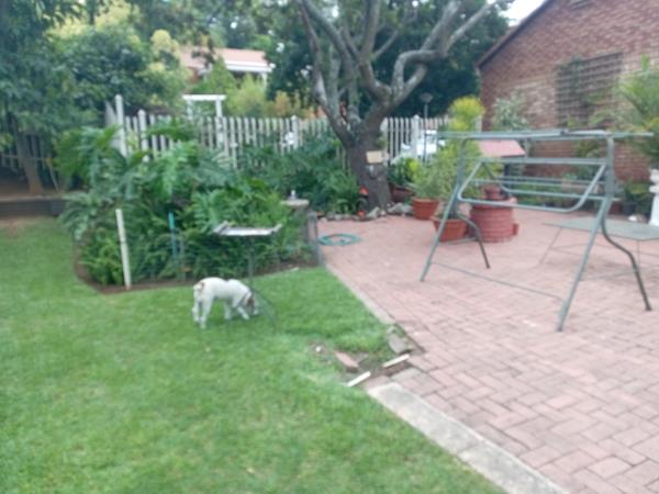 The home features a beautifully maintained backyard garden with a Mboma-style braai area, perfect for entertaining and outdoor living. The garden gently slopes down the hillside and is surrounded by mature trees, providing natural shade and a cool, tranquil setting ideal for relaxing during hot summer days.