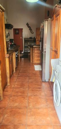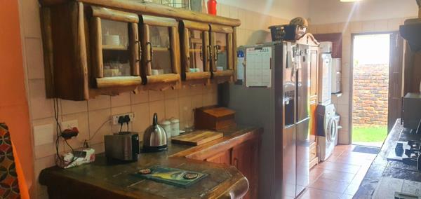 The kitchen is cozy yet functional, featuring custom log-wood cabinetry and warm-toned floor tiles, perfectly complementing the homes earthy aesthetic.
