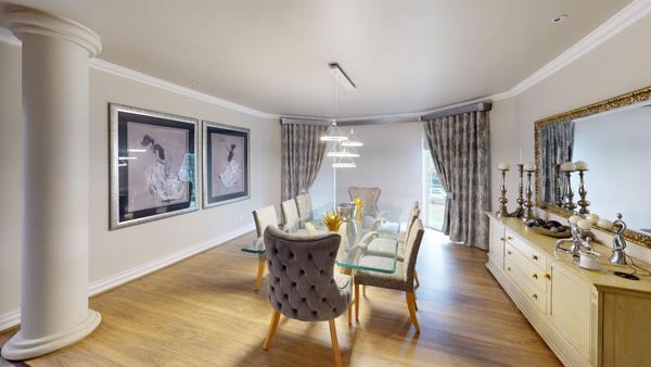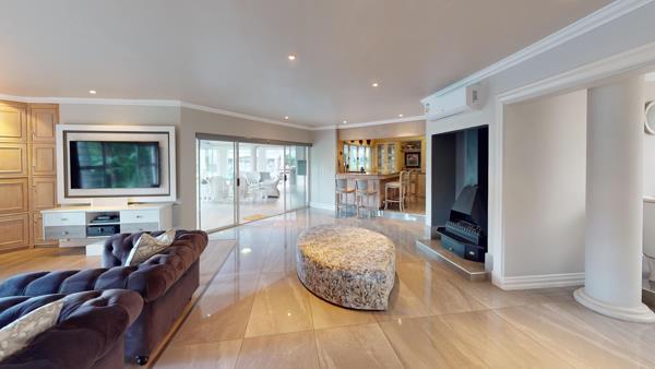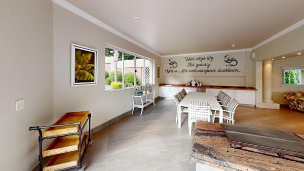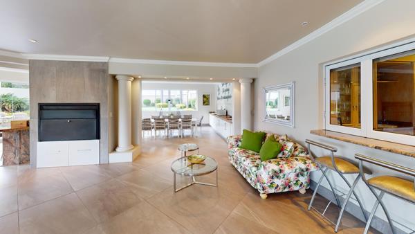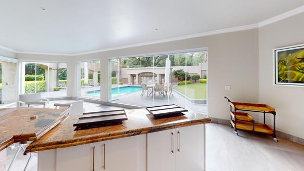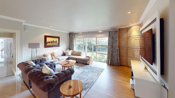 Two of the bedrooms open onto private balconies, showcasing panoramic views of the lush garden and surrounding mountains. The main bedroom connects to a stylish pajama lounge, creating a tranquil retreat within the home. Multiple lounges, expansive dining areas, and a state-of-the-art Easy Life fitted kitchen make this home ideal for both grand entertaining and intimate family moments.