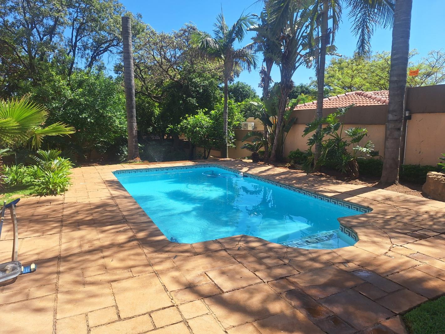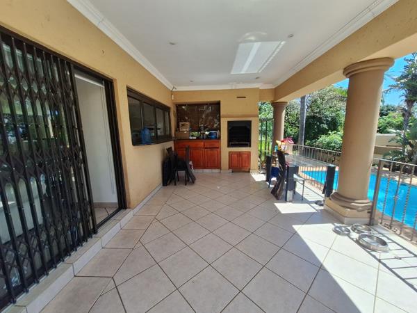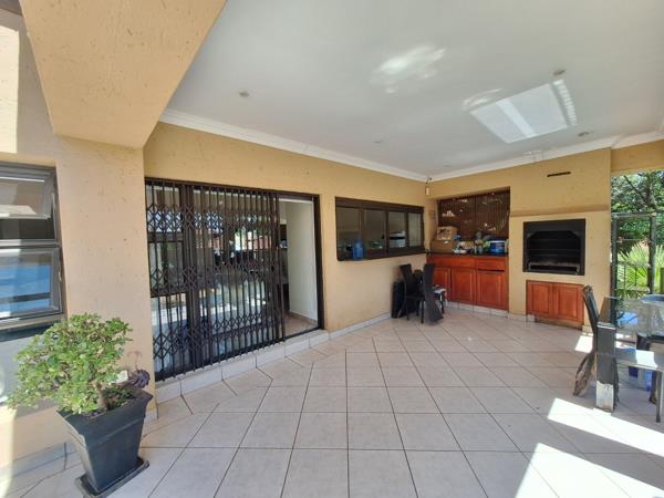 Enjoy year-round entertaining in the covered entertainment area overlooking the sparkling blue pool, complete with a built-in braai. The large, landscaped garden is kept lush with an automated sprinkler system, creating a serene outdoor setting.