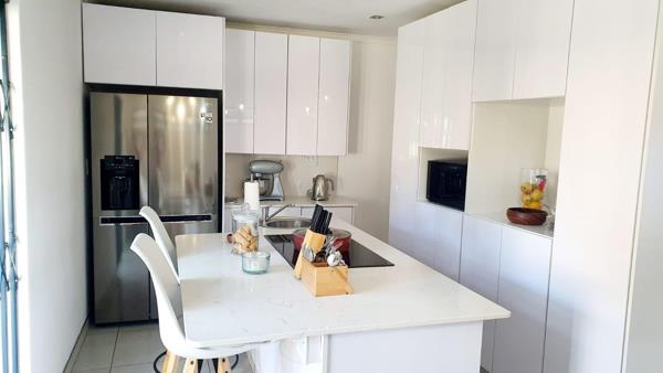 Newly fitted white gloss kitchen with push hinges, granite tops, and new touch screen stove.