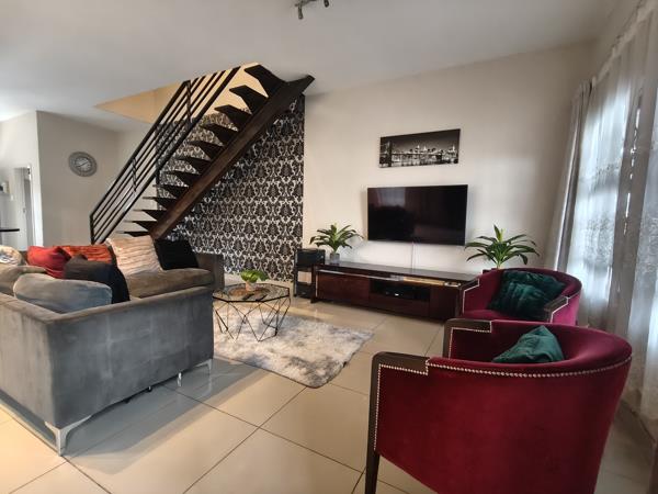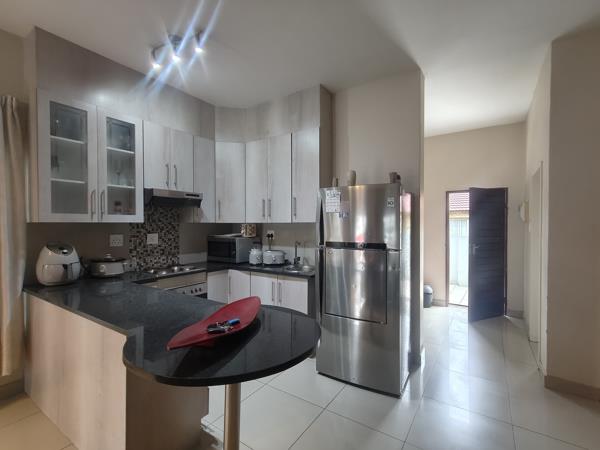 This stunning home features a modern open-plan kitchen with a separate scullery and ample storage space, perfect for effortless meal preparation. The spacious lounge area flows seamlessly, creating an inviting space for relaxation and entertainment. A convenient guest toilet is also located downstairs.