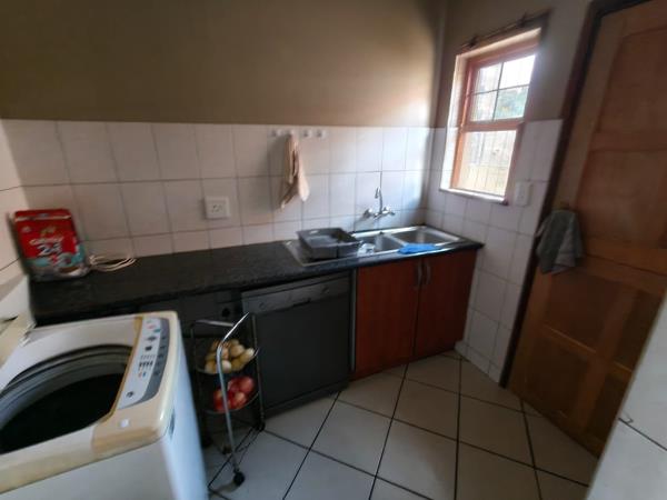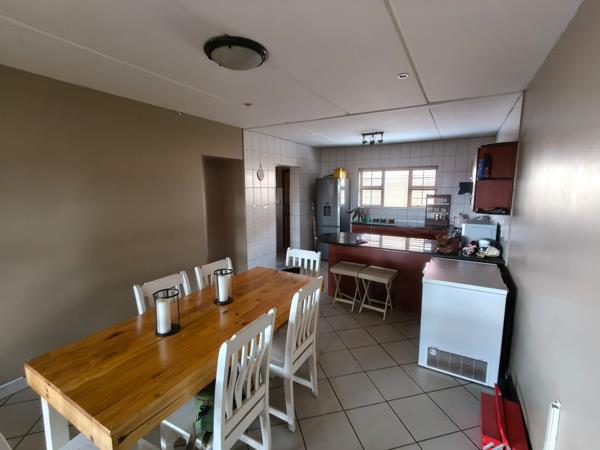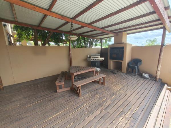 Downstairs, you are welcomed into a spacious lounge that flows into the open-plan kitchen and dining area. This layout makes the home feel open and inviting, perfect for everyday living. The kitchen is practical and well planned, with a separate scullery and laundry to keep the living space tidy. A guest toilet downstairs adds extra convenience. From the living area, you step outside onto a deck with a built-in braai, ideal for relaxing or entertaining family and friends.
