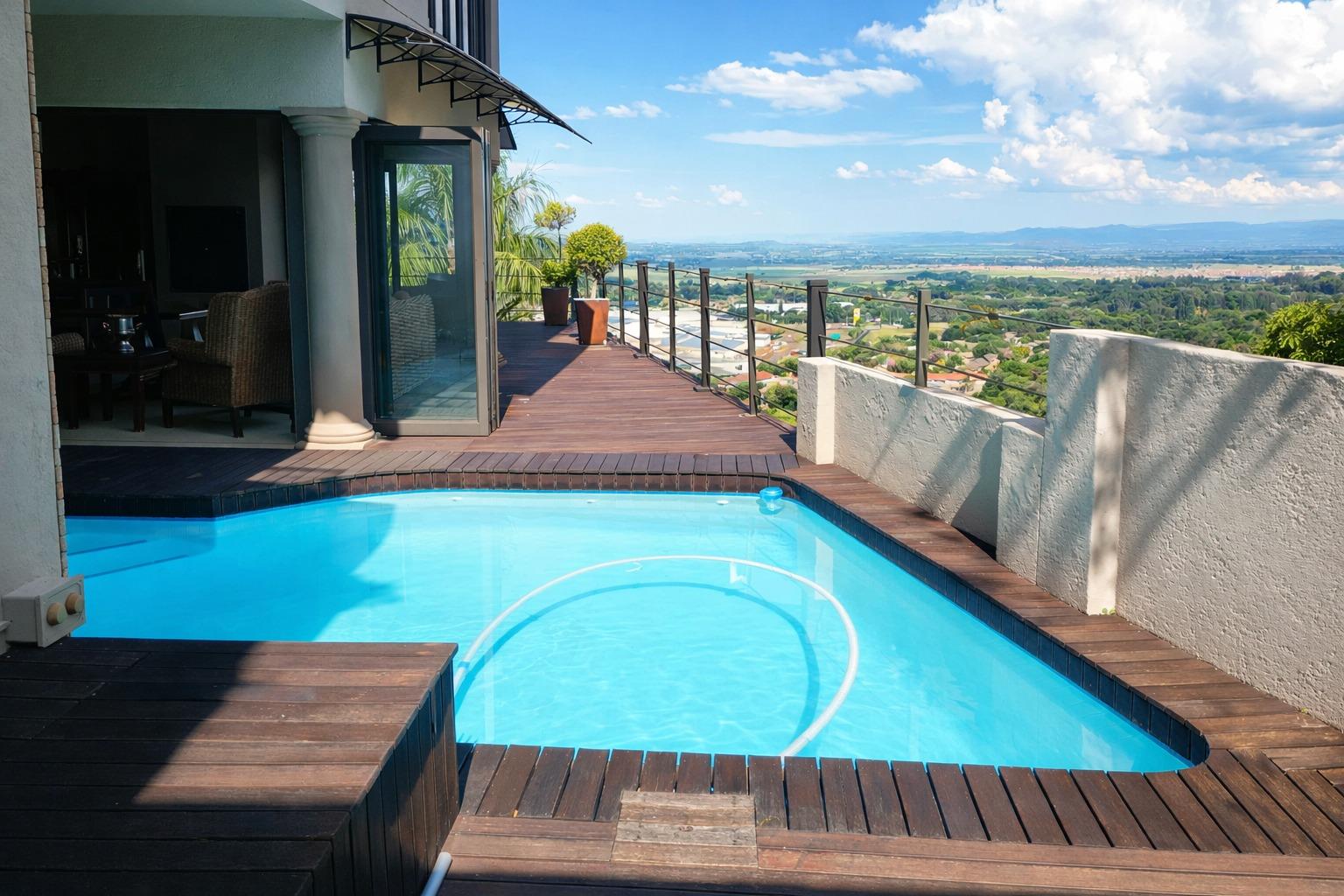 - Glass and aluminium doors open onto a huge deck and swimming pool, perfect for outdoor living while enjoying an awesome view!