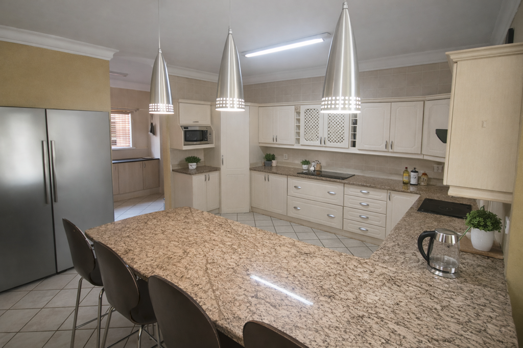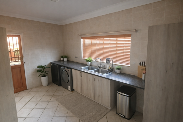 The property is further enhanced by a beautifully landscaped garden with strategically placed spotlights that illuminate the entire home, creating a warm ambience while enhancing security. An electric gate offers controlled access, while three garages with additional storage, shade-net parking, and ample guest parking ensure more than enough space for vehicles.