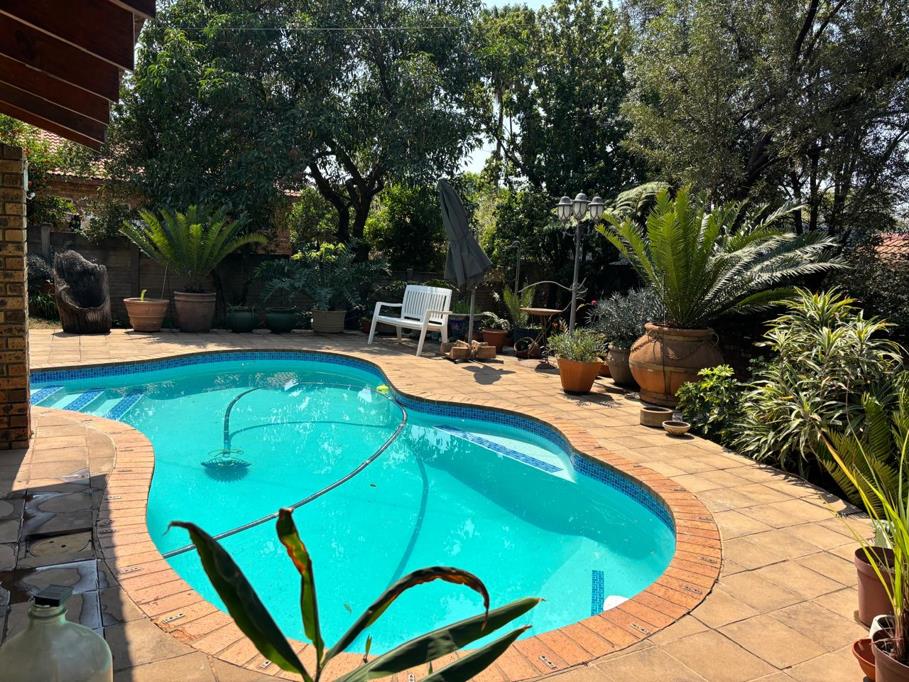 Flowing from the second lounge is a spacious patio with a built-in braai, overlooking a beautiful swimming pool and well-maintained garden perfect for entertaining. With build in bar.