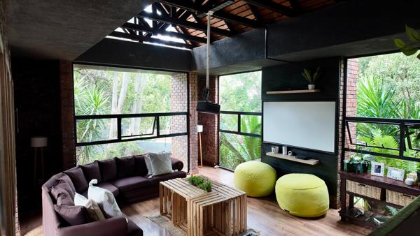 The home offers a modern kitchen, open-plan dining area and lounge, all complemented by large dark-framed windows that create a stylish and light-filled living space.