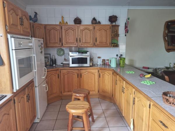 Outdoors, the charming patio features a thatched roof and a built-in braai area, overlooking a sparkling swimming pool an ideal setting for relaxing weekends and hosting guests. The property also includes a domestic room with a shower and toilet for added convenience.