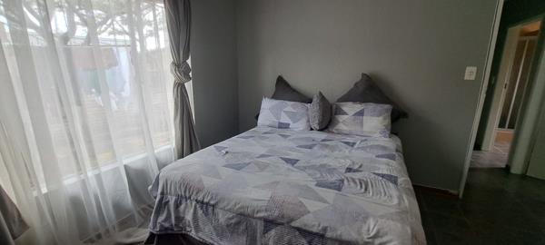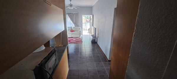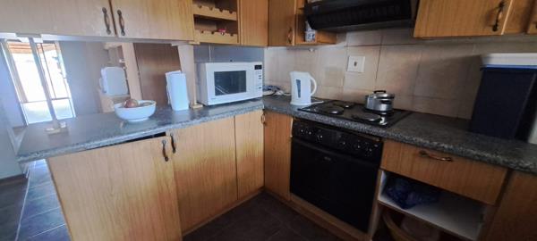 The open-plan kitchen effortlessly connects to a welcoming lounge area, creating a warm and inviting atmosphere perfect for relaxation and entertaining. A dedicated dining area sits nearby, leading out to a patio complete with a built-in braai, making it the ideal setting for social gatherings and alfresco dining.