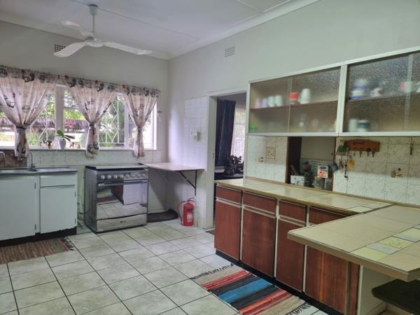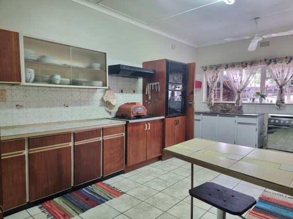 Inside, the generous 270 sqm floor plan includes a spacious lounge and a dedicated dining room. The functional kitchen is equipped with extensive cabinetry, tiled countertops, a built-in oven, and a freestanding stove, complemented by a scullery and pantry. A dedicated laundry room enhances practicality. The home also features a built-in bar and air conditioning for comfort.