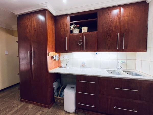 The kitchen is well-equipped with plenty of cupboards, drawers, and custom-built spice racks and storage shelves ideal for staying organised. There is also a separate scullerylaundry area with handmade shelving for your laundry needs.