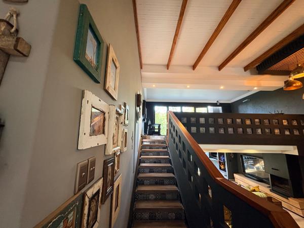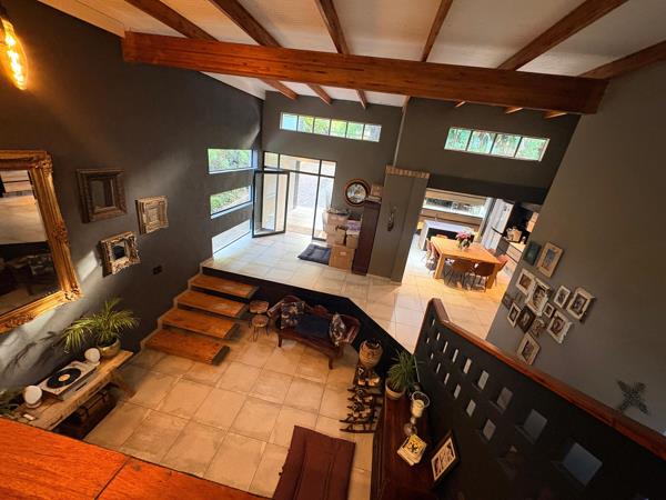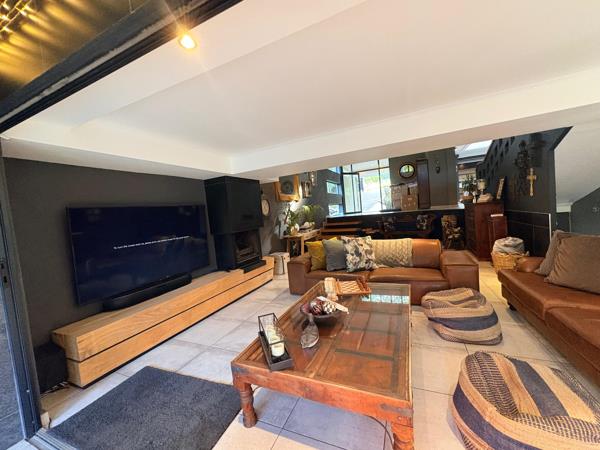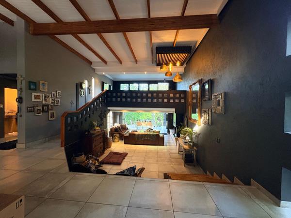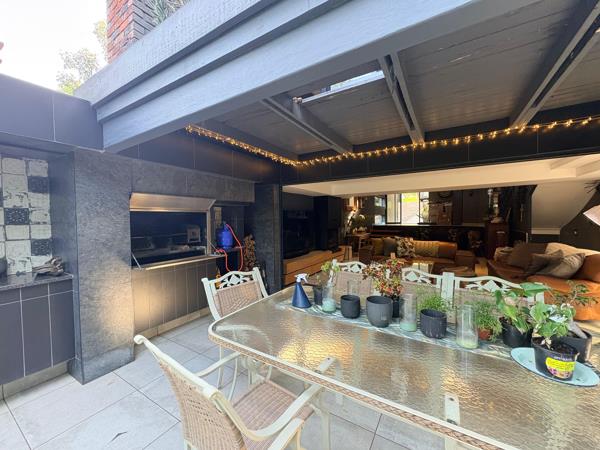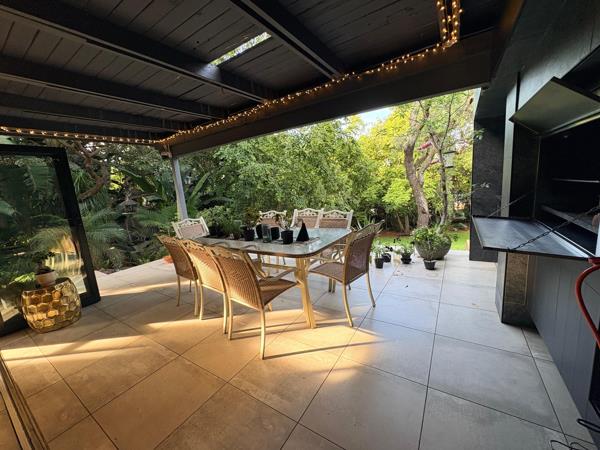 Designed for exceptional entertaining, the home includes a sparkling pool, lapa, boma, jacuzzi with built-in TV, and a built-in braai. Stacking doors from the bedrooms open directly to the lush garden, creating seamless indoor-outdoor living.
